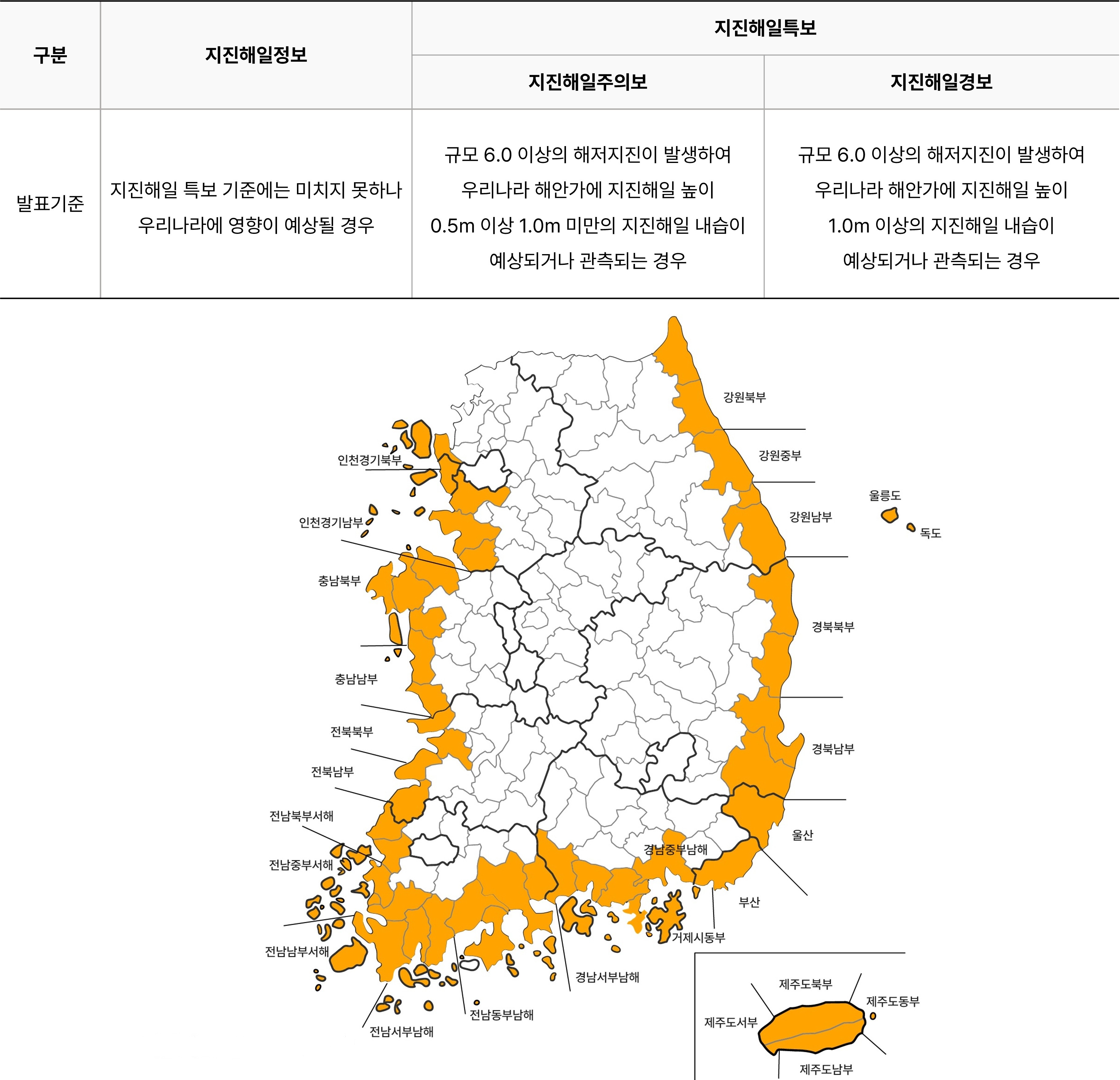 한반도 인근 해역에서 대규모 지진이 발생하여 우리나라에 지진해일 피해가 예상되는 경우 지진조기경보 시스템과 연계하여 지진해일 특보(주의보, 경보) 및 정보를 발표한다. 지진해일 특ㆍ정보에는 발표시각 및 해당구역, 주요지점의 지진해일 예상 도달시간 및 예상높이, 지진발생 현황 등의 내용을 포함한다.